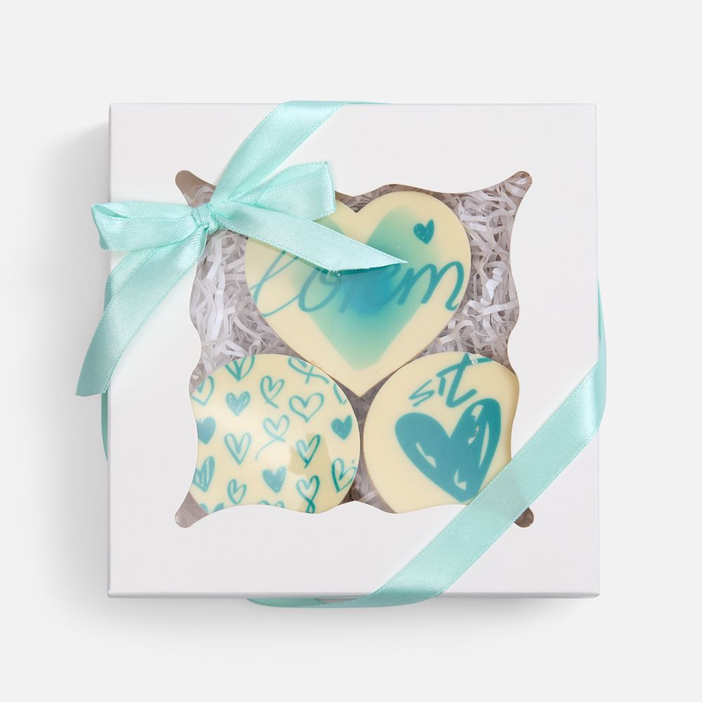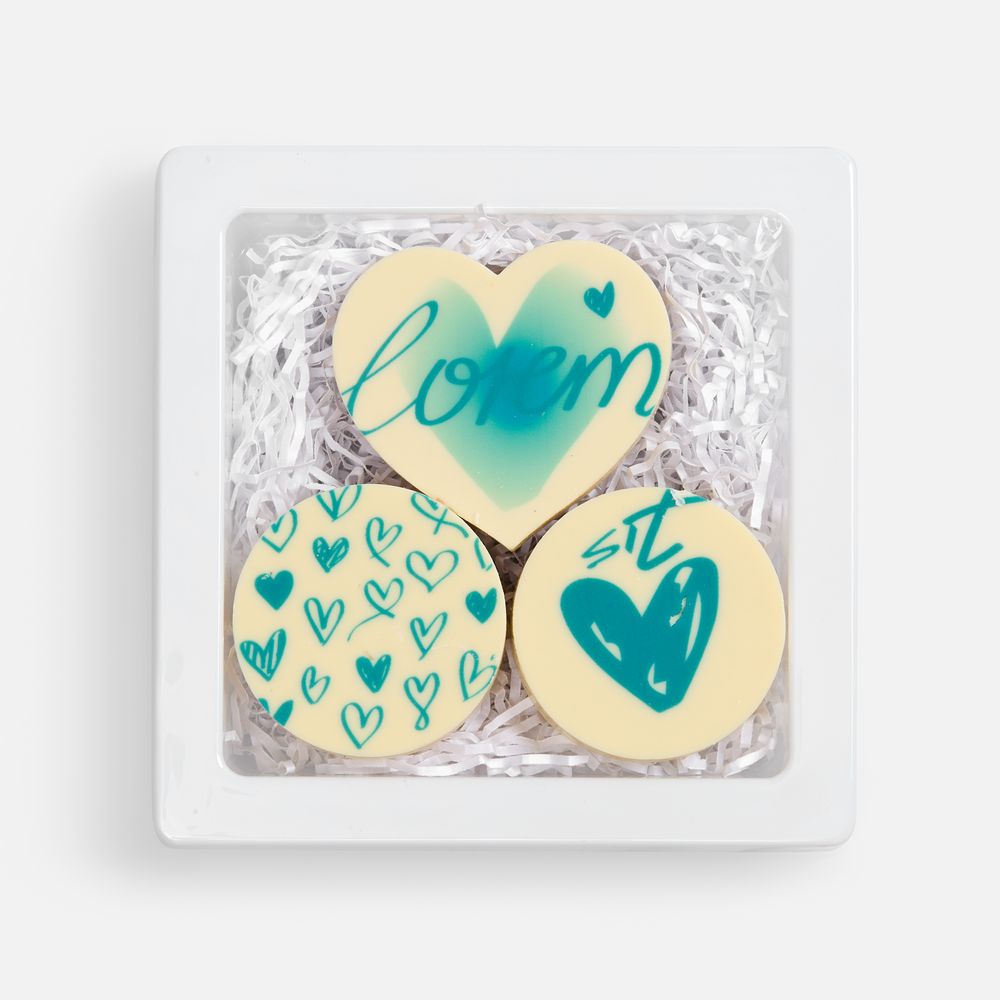 Набор из трех печений представлен в элегантной коробке с атласной лентой — готовый подарок, который говорит о вашем внимании к деталям.