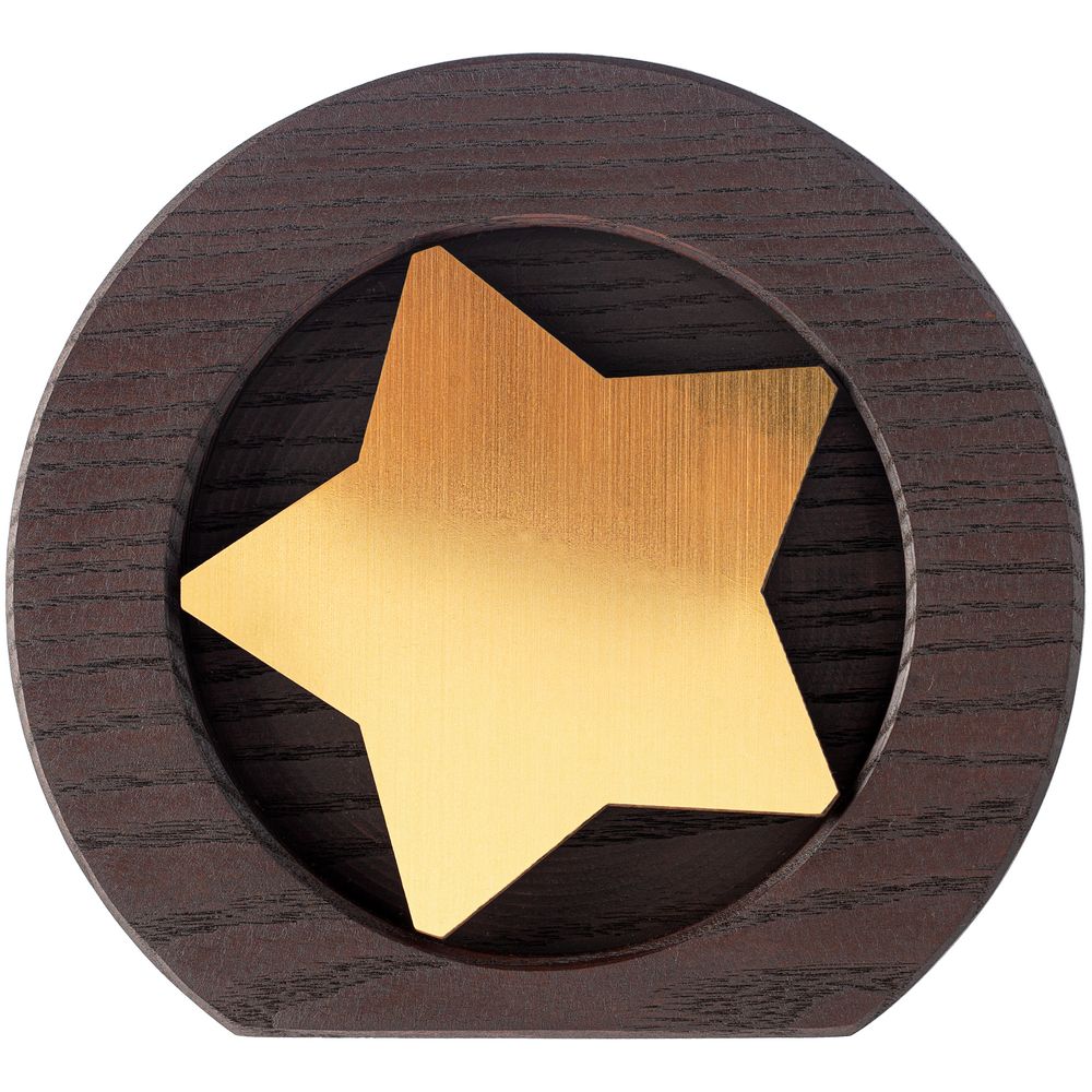 Вставка со звездой из зеркального пластика на деревянной основе крепится на приподнятое основание внутри стелы, что создает объем и многослойность награды. На вставке предусмотрен клеевой слой для крепления после нанесения.