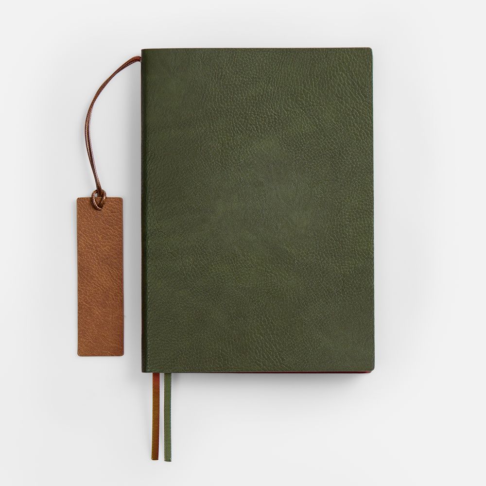 Ежедневник с гибкой обложкой и закладкой из искусственной кожи, дополнен капталом и двойным ляссе.