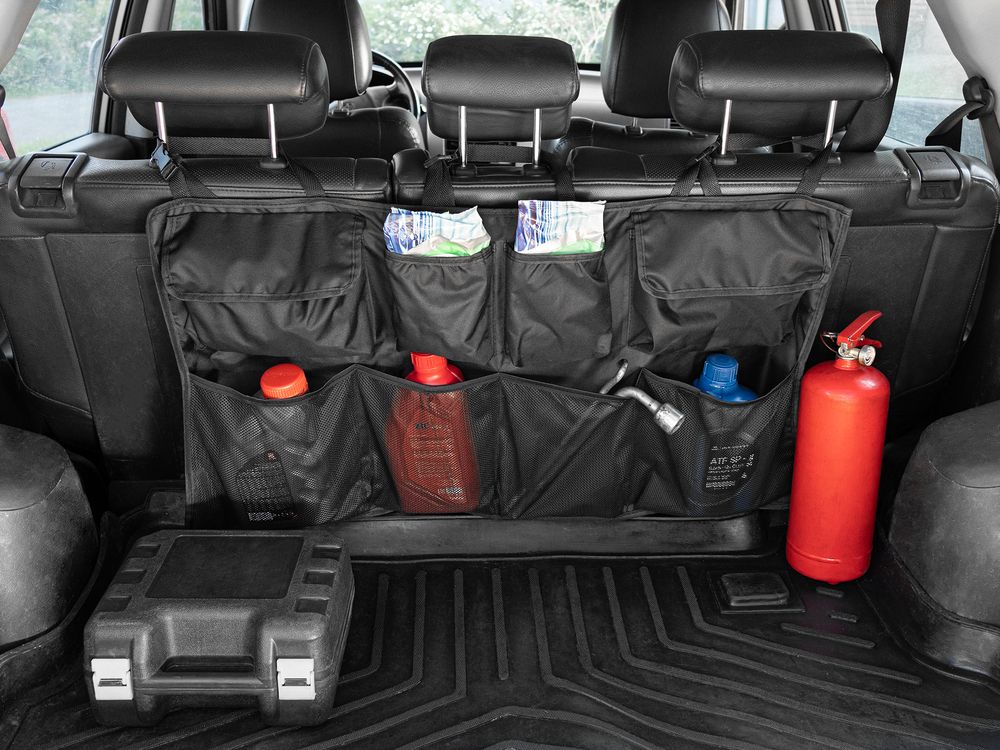 В органайзере имеются разные по форме и типу карманы: карманы-сетки, карманы с крышкой на липучке и открытые карманы. Конструкция крепится ремнями за подголовники задних сидений. Дополнительно на его задней части имеются ленты-липучки, которые обеспечивают полное прилегание к спинкам задних кресел.