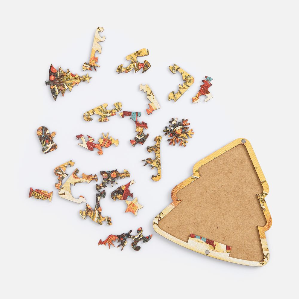 Деревянные элементы пазла разработаны с особой тщательностью: каждая деталь имеет уникальную форму, вдохновленную самим Новым годом, что делает процесс сборки особенно увлекательным и творческим.