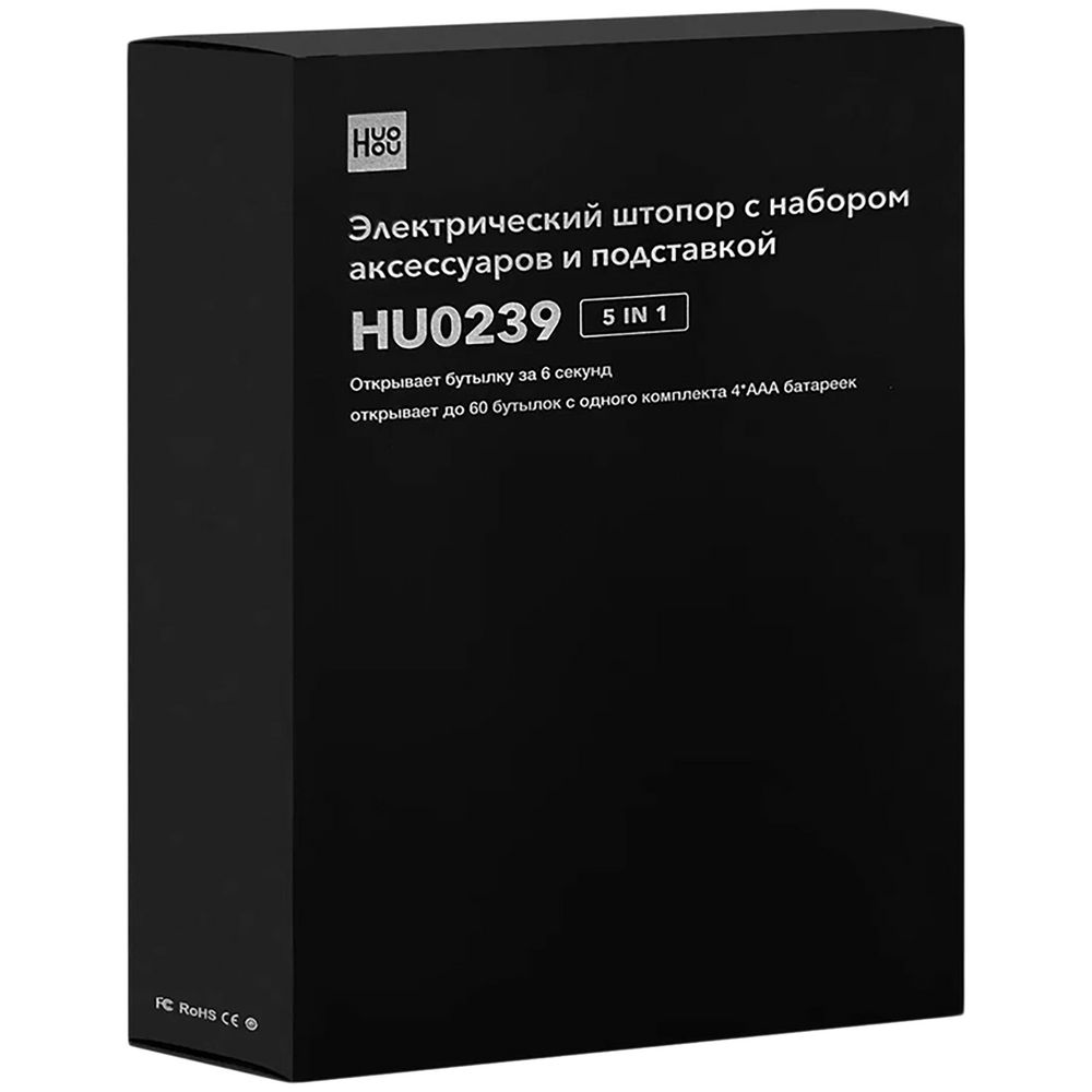 В наборе электрический штопор, резак для фольги, механическая пробка, механический аэратор, подставка, инструкция.