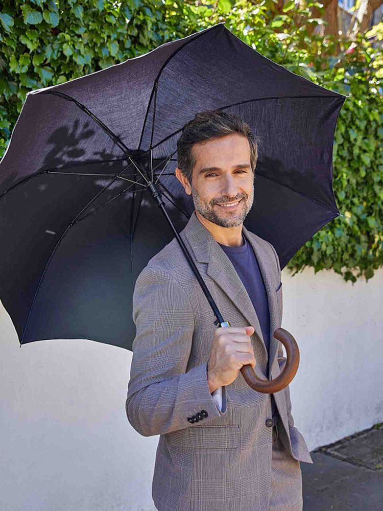 Большой фактурный купол сделан из люксового поликоттона, который очень красиво и необычно смотрится на свету. Деревянная рукоятка с металлическим кольцом, под которое заправляются спицы, добавляет аксессуару престижа и изящества.