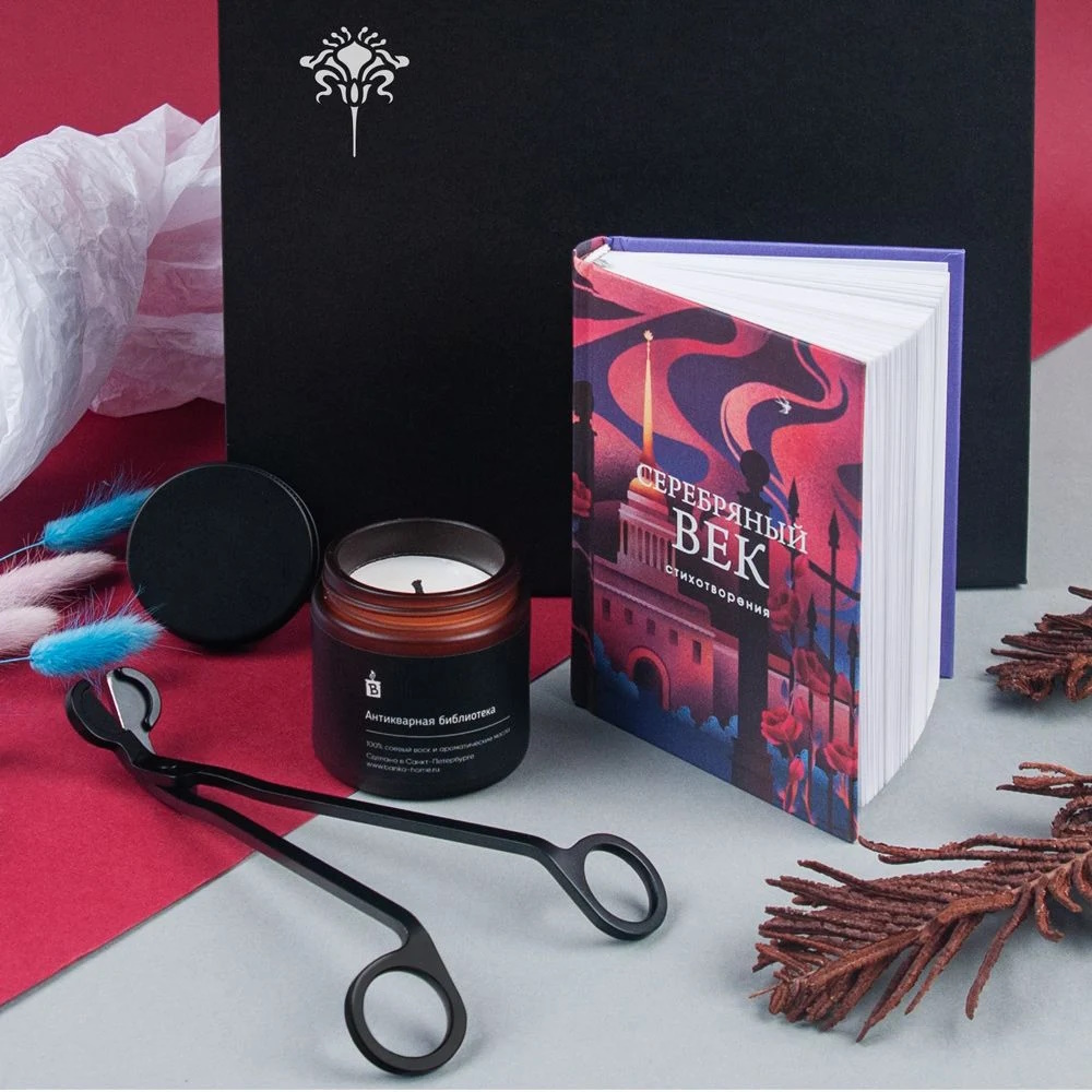Подарочный набор «Серебряный век» — это настоящее путешествие в мир поэзии, искусства и эстетики одного из самых ярких культурных периодов в истории России. В комплекте — книга с произведениями великих поэтов Серебряного века, которые своим творчеством переворачивали представления о слове и смысле. Тонкий аромат свечи «Антикварная библиотека» окунет вас в атмосферу старинных библиотек и уютных вечеров, когда страницы книг оживают в свете пламени. Для особого ритуала создана пара элегантных ножниц для подрезки фитиля, которые подчеркнут утонченность момента.